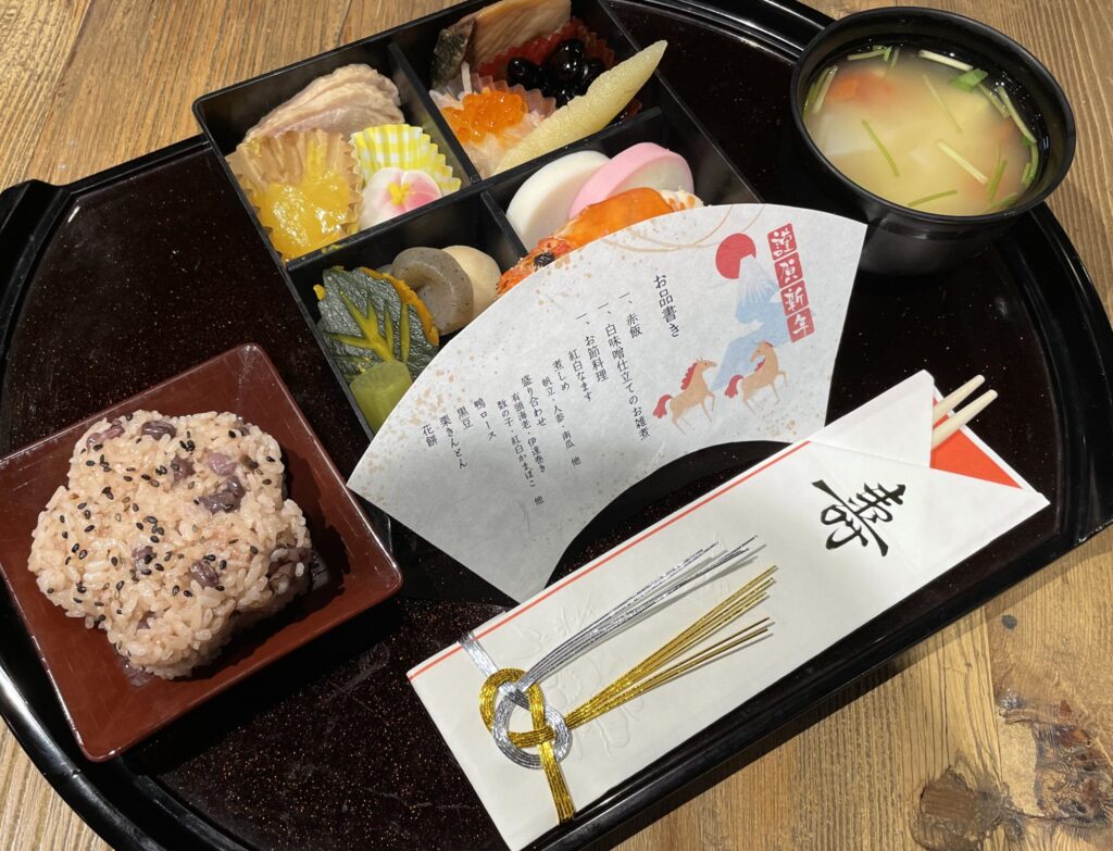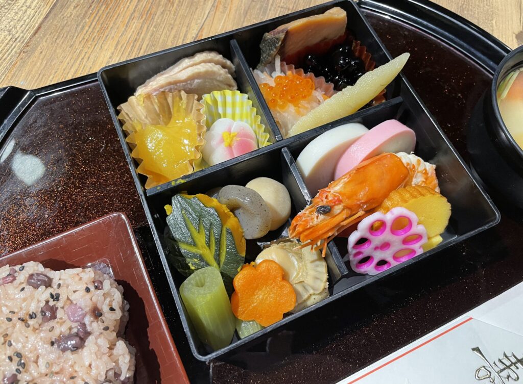 ぶりの照り焼き、数の子、大根なます、伊達巻き、有頭海老、栗きんとんなど定番の物から、合鴨ロースや煮しめには帆立て貝も入っており