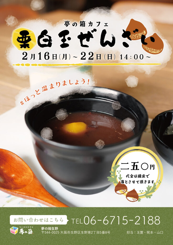 2月16日から22日の7日間、栗白玉ぜんざいの提供が始まります🫘